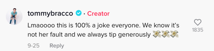 "Lmaoooo this is 100% a joke everyone," Bracco wrote. "We know it's not her fault and we always tip generously."