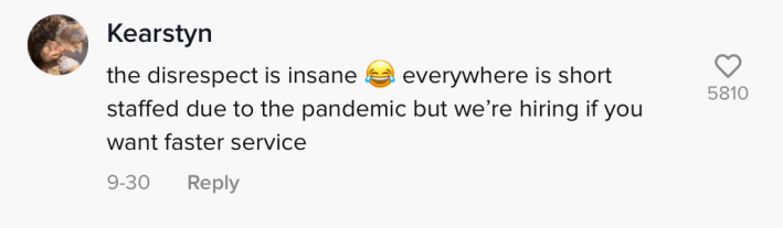 Commenters again took the opportunity to remind the poster that most places are short-staffed but hiring if he wants to join the crew. "The disrespect is insane," a commenter wrote. "Everywhere is short staffed due the pandemic but we're hiring if you want faster service."