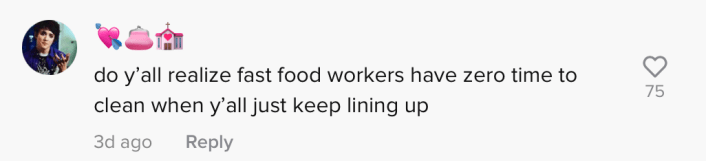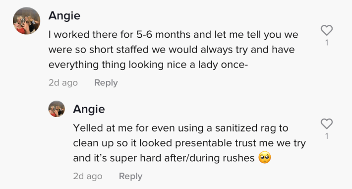 "I worked there for 5-6 months and let me tell you we were so short staffed we would always try and have everything looking nice," the commenter wrote. "A lady once yelled at me for even using a sanitized rag to clean up so it looked presentable. Trust me we try super hard after/during rushes."