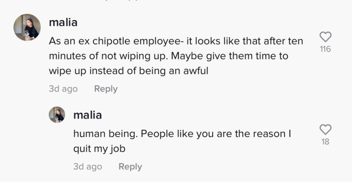 "As an ex Chipotle employee——it looks like that after 10 minutes of not wiping up," the commenter wrote. "Maybe give them time to wipe up instead of being an awful human being. People like you are the reason I quit my job."