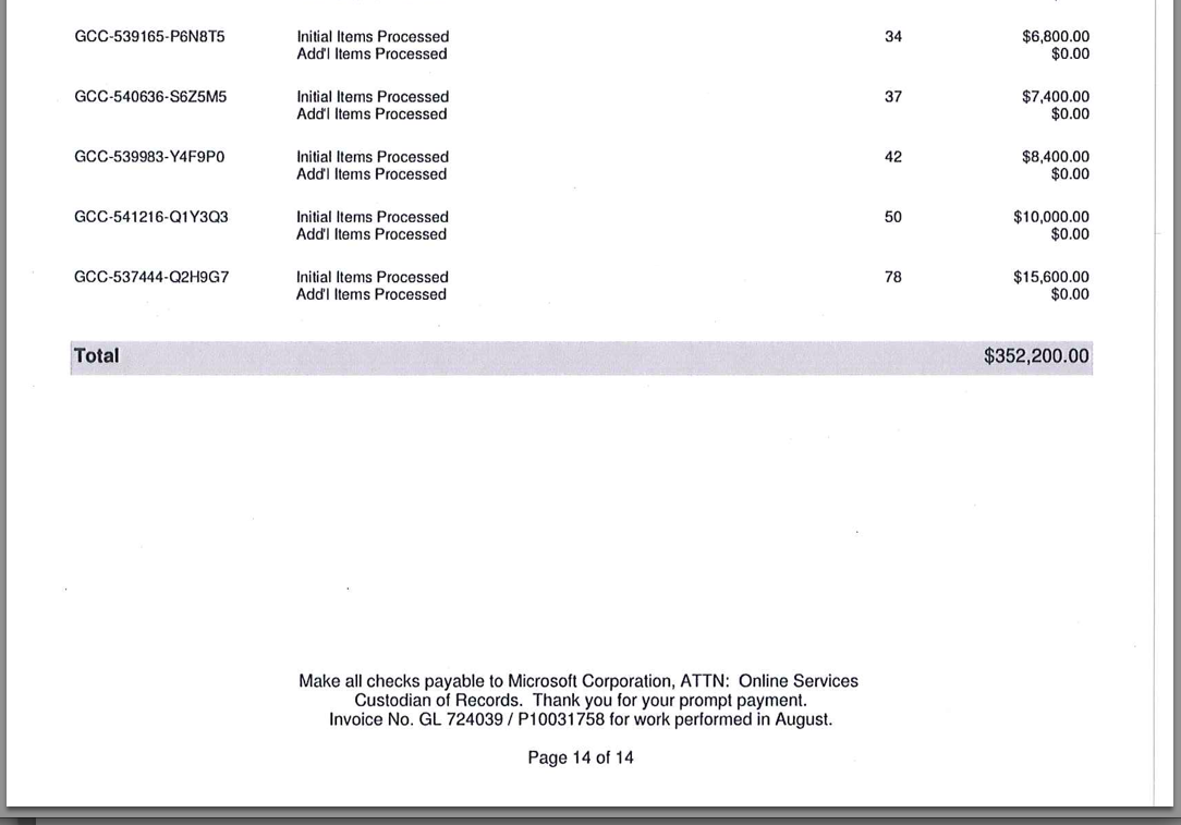 In December 2012, for instance, Microsoft emailed DITU a PDF invoice for $145,100, broken down to $100 per request for information, the documents appear to show. In August 2013, Microsoft allegedly emailed a similar invoice, this time for $352,200, at a rate of $200 per request. The latest invoice provided, from November 2013, is for $281,000.