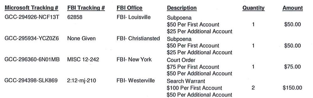 Only the earliest of the Microsoft invoices provided by the SEA, dated May 10, 2012, breaks down requests by type of legal request, and it shows them to all explicitly come legally, though nothing in the documents indicates the later invoices refer to illegal surveillance. User information by a subpoena costs $50, a court order $75, and a search warrant $100. The requests come from FBI offices all around the U.S.