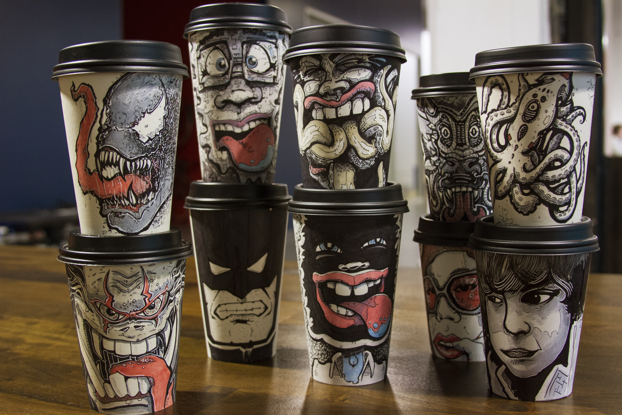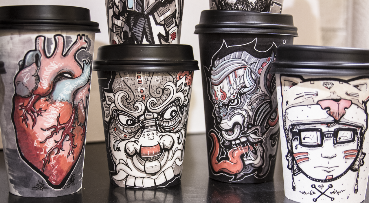 I decided to start selling the cups for a charity one day at the coffee shop because I had too many on display, and people were asking if they could buy them. Because it is a disposable cup, people assume it’s not worth very much, even though I put some time into the work. I did some research on Bay Area charities, and Project Night Night seemed like something I could really get behind. The homeless problem in the Bay Area is pretty bad, and I wanted to be able to make a quantifiable difference. 1 cup sold = 1 care package for a child in need.