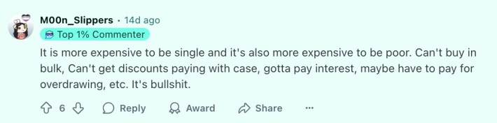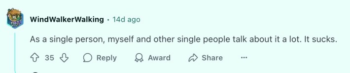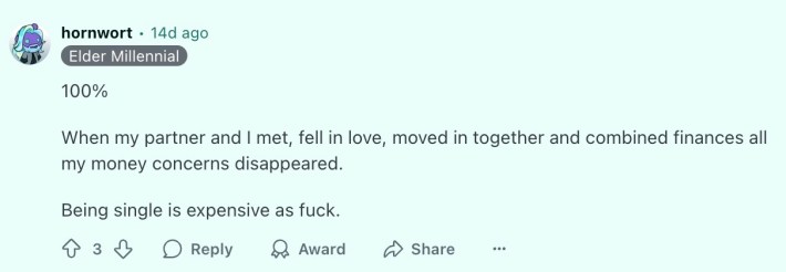 "This feels like the biggest financial barrier that no one talks about," wrote u/dmans218, a redditor from Canada. "The economy is designed for pairs. Not individuals."