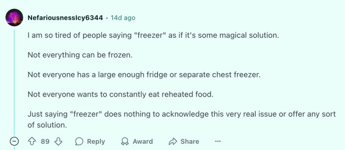 But a single person often can't get through that kind of food alone before it spoils. And others pointed out even regular packages of food are often designed with families in mind and present the exact same challenge.