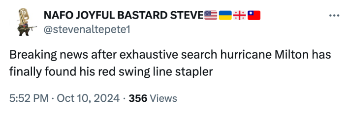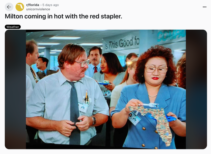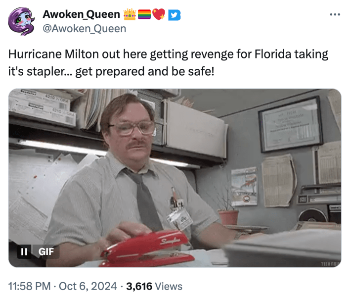 Naturally, people are coping by making hurricane memes about returning Milton’s stapler.