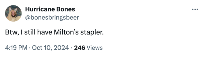 When living through natural disaster after natural disaster, dark humor is one way many people cope. Fans of the classic dark comedy Office Space made note of this latest hurricane’s name, Milton, and began posting memes on all social media platforms. In the 1999 film, Milton Waddams is a corporate drone who wants to work in peace and have his red Swingline Stapler returned to him.Â