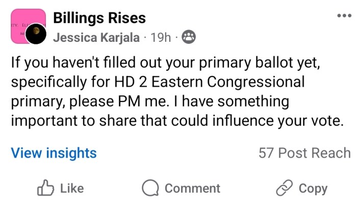 "If you haven't filled out your primary ballot yet, specifically for HD 2 Eastern Congressional primary, please [private message] me," Karjala posted. "I have something important to share that could influence your vote."