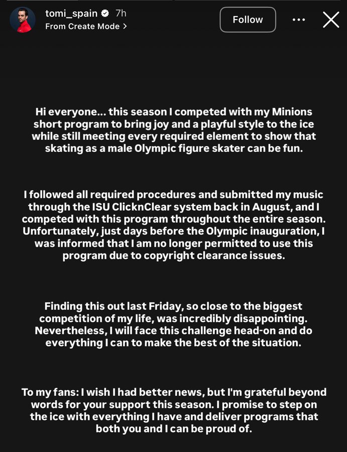 "Unfortunately, just days before the Olympic inauguration, I was informed that I am no longer permitted to use this program due to copyright clearance issues. Finding this out last Friday, so close to the biggest competition of my life, was incredibly disappointing."