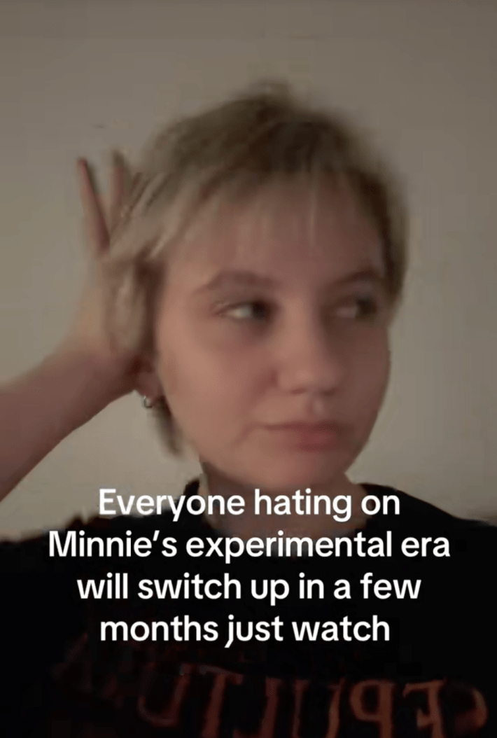 Another creator, @denizsenoo, posted a clip with text reading, “Everyone hating on Minnie’s experimental era will switch up in a few months, just watch.”