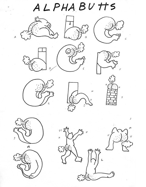 My dad, Mike Fleishman, is an illustrator and teacher. When I was a kid, he taught my brother and me our ABCs by sketching each letter as a cartoon butt. He called the series “AlphaButts,” and the paper hung proudly on a bulletin board in his office for the next two decades.