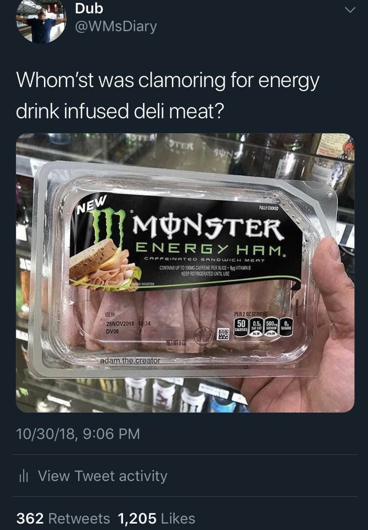 On All Hallows’ Eve, I saw a clearly photoshopped image of a Monster Energy-infused ham product (a meme made by Adam The Creator). As a normal person, I was disgusted and downright bewildered that someone took the time to do this, but as a Twitter user addicted to those sweet, sweet likes and retweets, I saw gold. I saved the image to my phone, came up with a caption using a made-up word, and hit the tweet button. Regular stuff. The likes, retweets, and mentions started pouring in and everything was good.