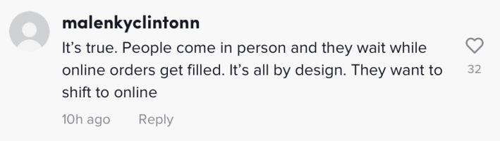 "It's true," one commenter wrote. "People come in person and they wait while online orders get filled. It's all by design. They want to shift to online."