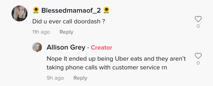 The original video, which got over 5.5 million views and 492,000 likes since posting Saturday, shows the Uber Eats order sitting on her neighbor's doorstep. She mistakenly refers to the order as one from DoorDash, but she later reveals it was actually from Uber Eats in a comment.