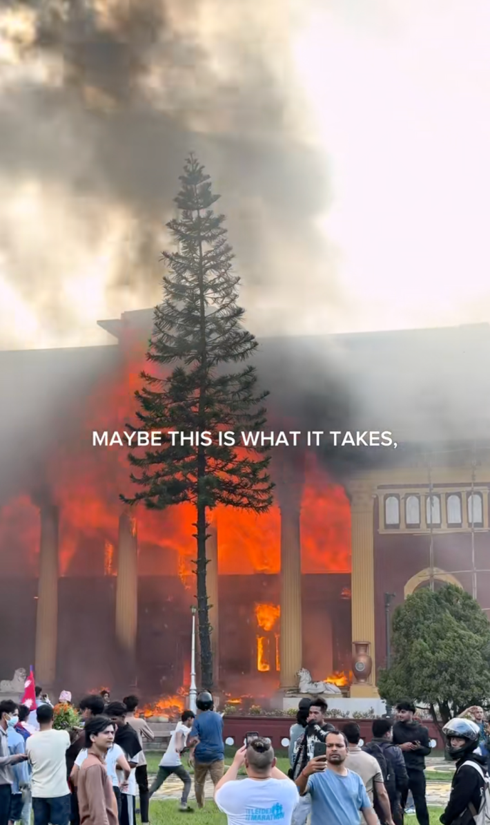 @diet_paratha Does Nepal do other countries too? God, this generation is so unserious. For context: Nepal’s Prime Minister KP Sharma Oli has stepped down following violent clashes between police and anti-corruption demonstrators that left 22 people dead. While the government’s ban on social media triggered the unrest, protestors main demands have been clear: the end of corruption and privilege among the political elite. Tiktok is flooded with youth declaring victory using the we won hashtag. Video: @SUNIL POKHREL #nepal #kathmandunepal #fire