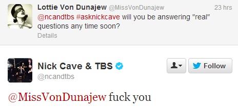 The Nick Cave and the Bad Seeds frontman said on Vine he was "roped into" doing the Twitter chat, and if his disdain for the experience wasn't already evident, he made sure to point it out in his tweets.