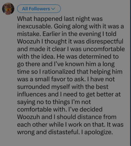 "I have not surrounded myself with the best influences and I need to get better at saying no to things I'm not comfortable with. I've decided Woozuh and I should distance from each other while I work on that."
