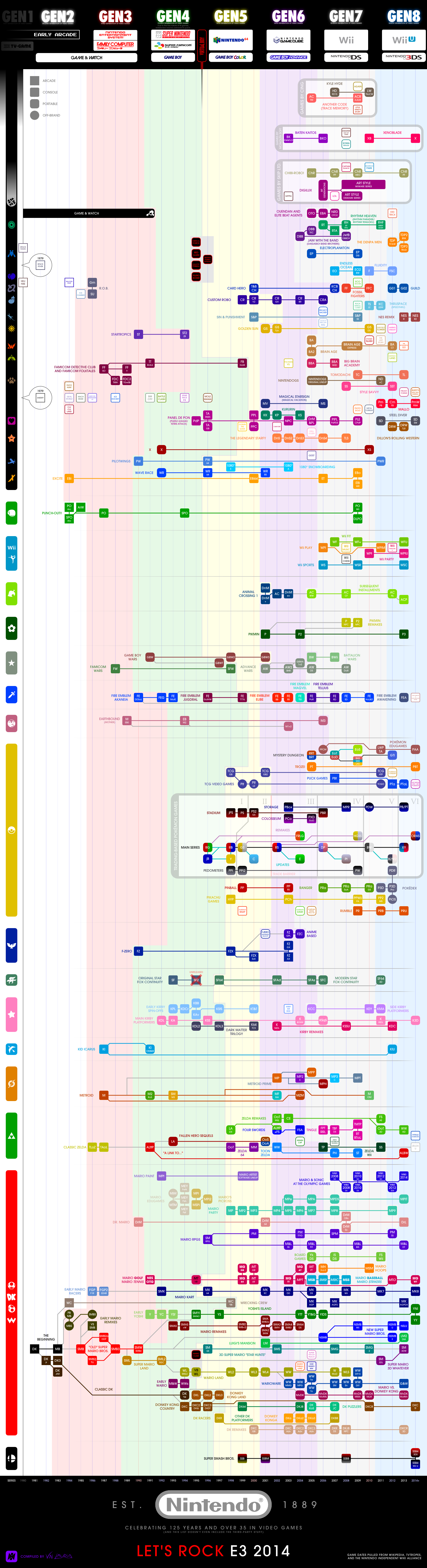Lucky for us, Vin Lauria, who goes by the handle VinLAURiA on Reddit, compiled an impressive and detailed graphic that lists each and every Nintendo property, including Legend of Zelda, Pokemon, and of course Super Mario Bros. The franchises are spread across all eight generations of gaming systems, beginning in the 1970s with home TV sets and ending on the company's current Wii-U and 3DS consoles.
