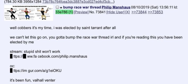The El Paso shooting, in which a 21-year-old male opened fire with an AK-47 at a Walmart, taking the lives of 22 people and injuring more than two dozen others. The accused gunman, in that case, is believed to have posted a manifesto to 8chan, making him the third person to do so before an attack.