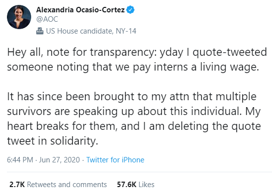 Ocasio-Cortez heeded their calls. After deleting the tweet, on Saturday, she tweeted, "Hey all, note for transparency: yday I quote-tweeted someone noting that we pay interns a living wage.
