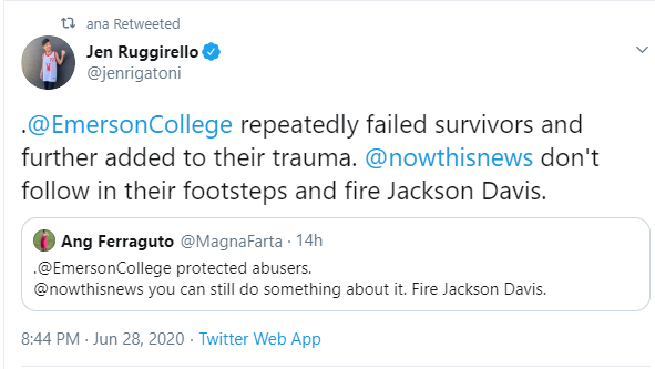 Following the barrage of tweets accusing NowThis associate producer Jackson Davis of sexual impropriety while he attended Emerson College, where he graduated in 2017, he was suspended from his position, the Wrap reports.