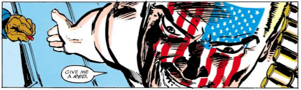 Nuke's powers come from a trio of color-coded pills (red, white, and blue), probably inspired by WWII amphetamine programs where soldiers were given stimulants to avoid fatigue during combat. Characterized as jingoistic and hyper-violent, Nuke is functionally addicted to the red pills that give him energy and make him impervious to pain.