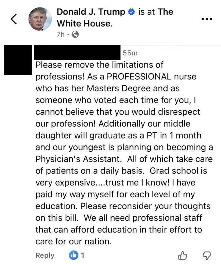 "All of which take care of patients on a daily basis," she continued. "Grad school is very expensive....trust me I know! I have paid my way myself for each level of my education. Please reconsider your thoughts on this bill. We all need professional staff that can afford education in their effort to care for our nation."