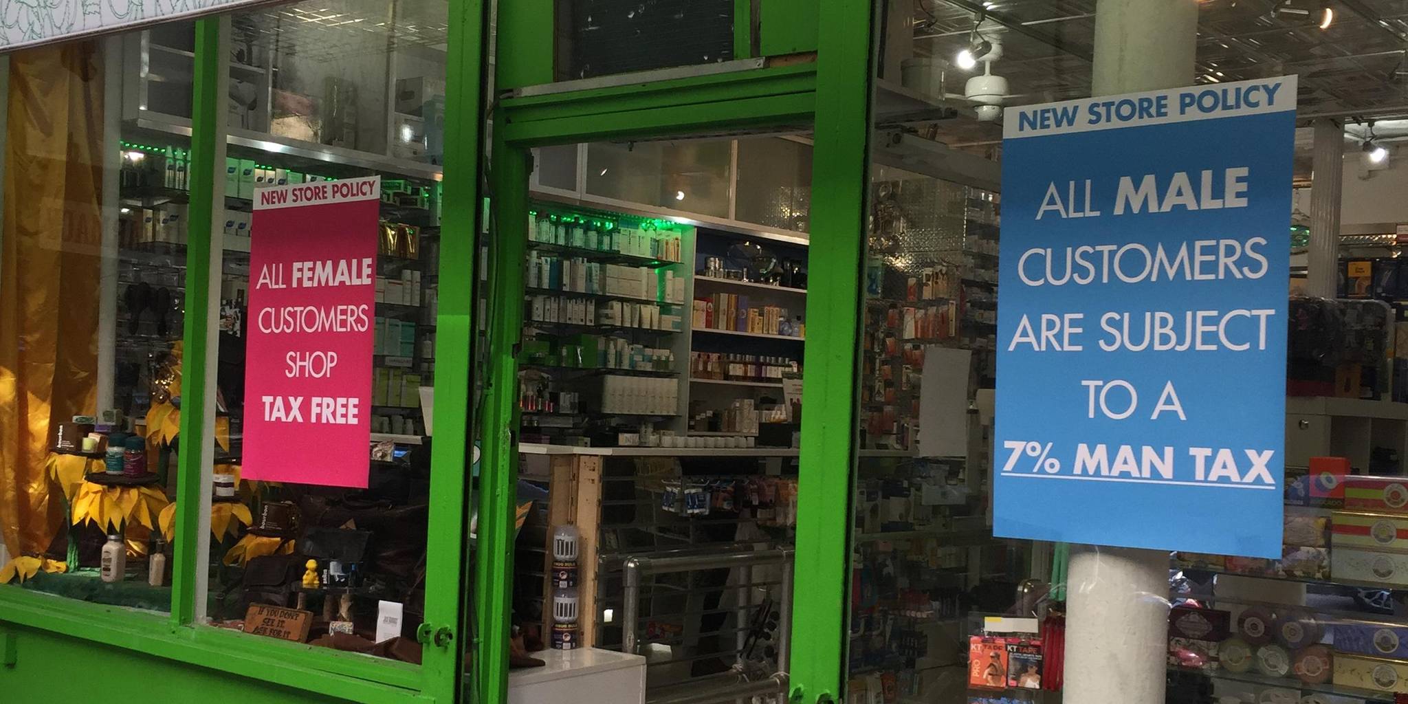 View post on imgur.comThompson Chemists owner Jolie Alony told the Daily Dot she put up the sign today, and it’s already gotten a lot of reaction. “We thought it’d be a great idea with all the political things going on—with Clinton being such a woman and the other guy and his womanizing,” she said. Citing the “pink tax,” she said, “We wanted to share that women deserve to get a break, and men deserve to be charged 7 percent more. Women are spending more in general and we make less, so we deserve to have a break.”