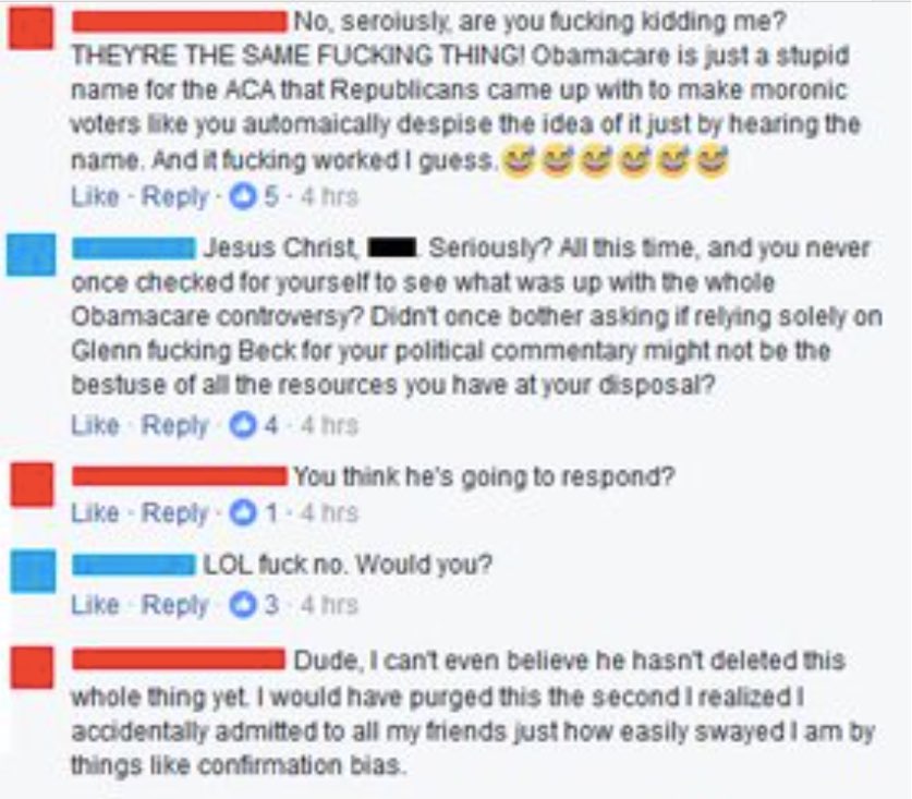 "Wait, if you're on Obamacare, why the fuck are you celebrating the outcome of this vote?" one of them wrote. "If the Republicans get what they want, you'll lose your insurance."