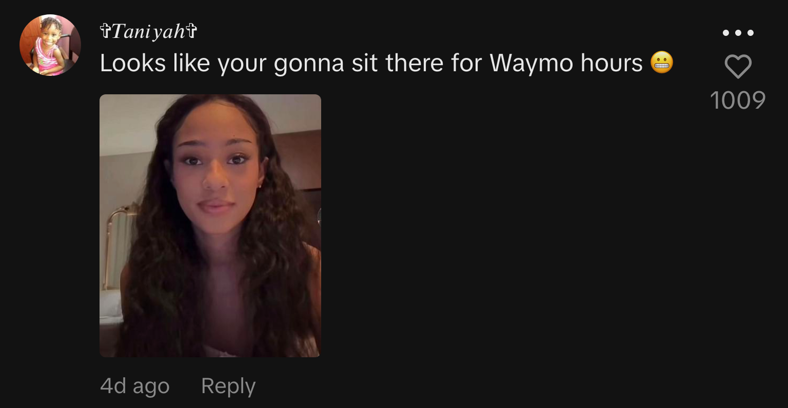 “Looks like your gonna sit there for Waymo hours 😬”