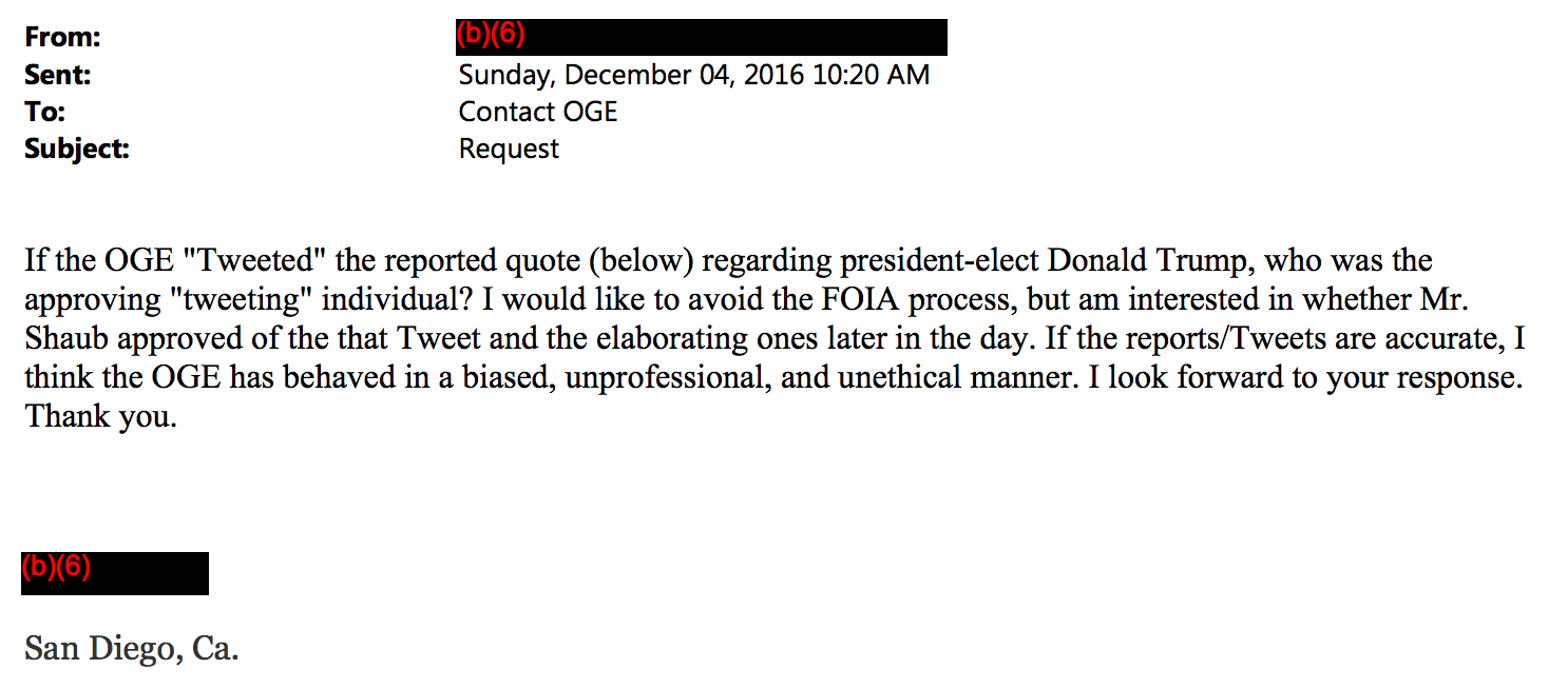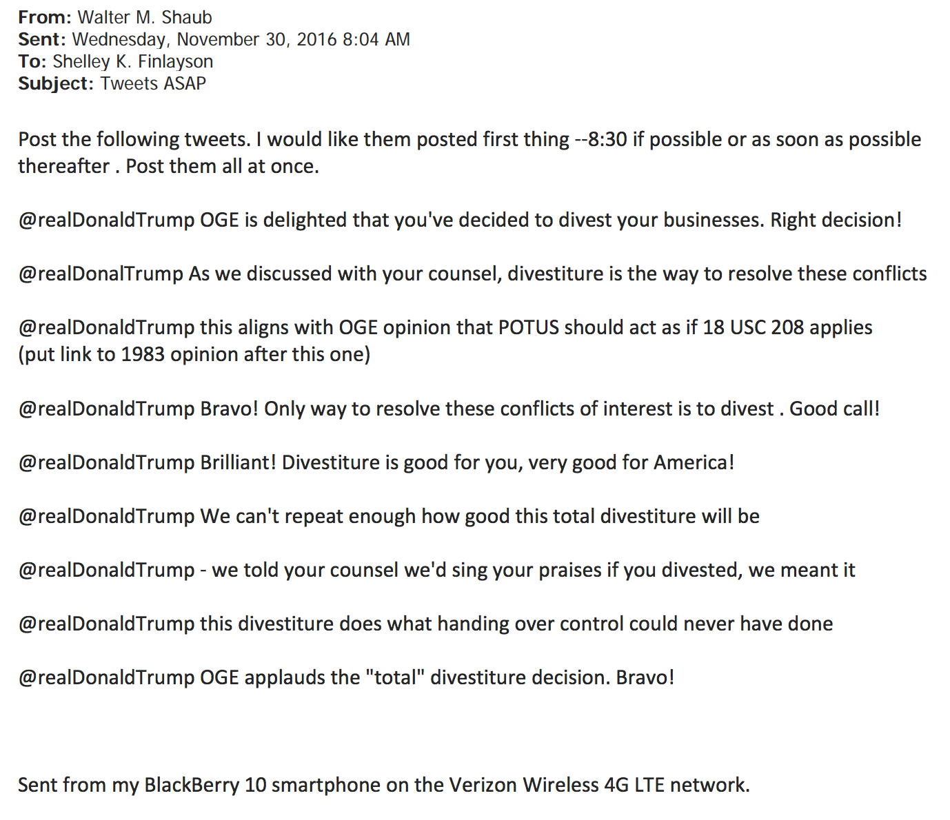 It is unclear from the emails whether Shaub, who was appointed by President Barack Obama to serve as OGE director in 2012, crafted the tweets himself; however, all were sent in the single email above from what appears to be Shaub’s personal BlackBerry device.