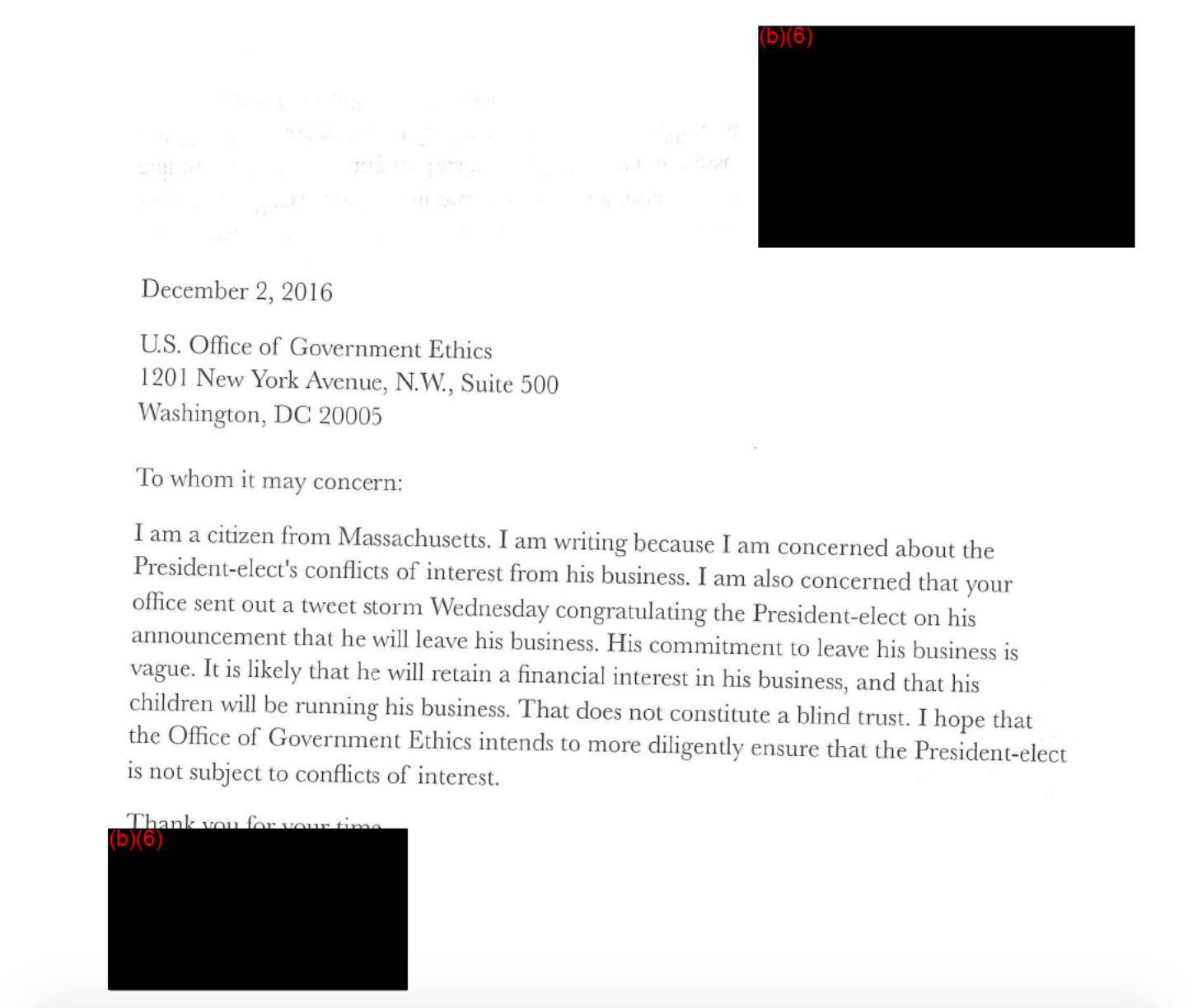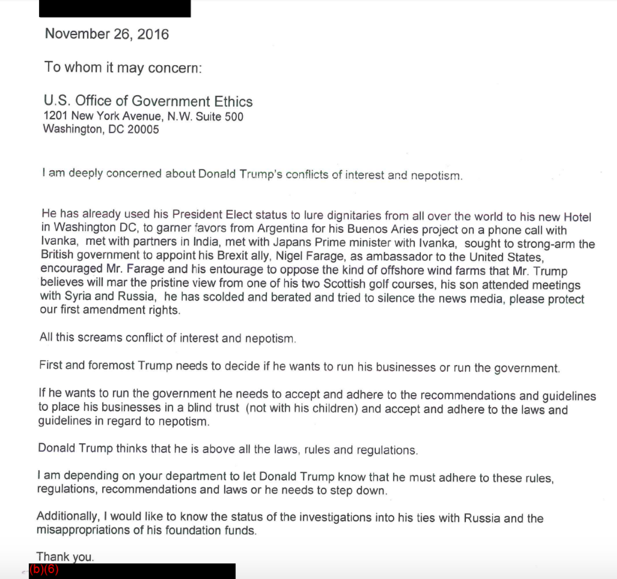 Other letters lament what the authors see as Trump’s conflicts of interest due to his global business dealings.