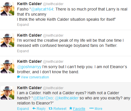 thisisnotthem quickly decided that Keith Calder’s defensiveness was further evidence of the Clive Calder/Eleanor/Management cover-up. However, a quick glance at his Twitter indicates that either he’s a really good liar or he doesn’t know anything about 1D or Eleanor Calder. Still, the steady stream of tweets from Larry Believers doesn’t seem to be letting up anytime soon.