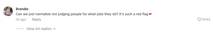 “Can we just normalize not judging people for what jobs they do? It’s such a red flag,” added Brandie.