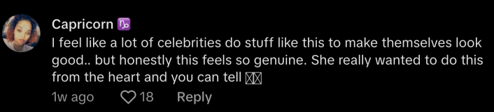 "I feel like a lot of celebrities do stuff like this to make themselves look good, but honestly this feels so genuine. She really wanted to do this from the heart and you can tell," said @queen_capricorn_energy.
