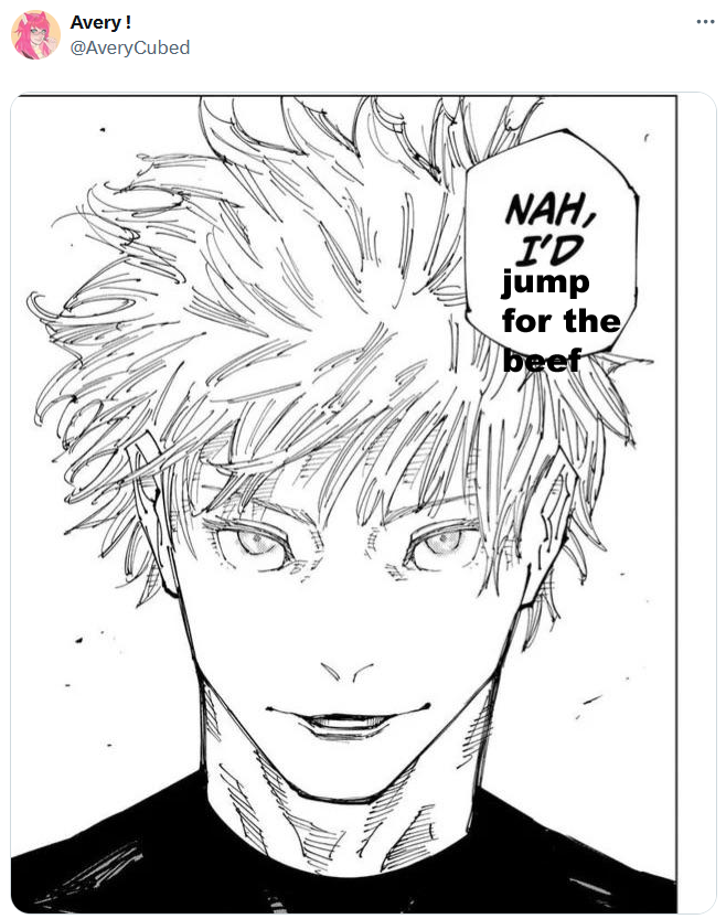 On September 29, Twitter user @AveryCubed posted an altered version of the panel from the manga Jujutsu Kaisen that became a meme in 2023, changing the line "Nah, I'd win" to "Nah, I'd jump for the beef."