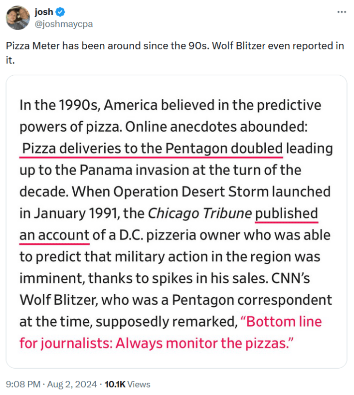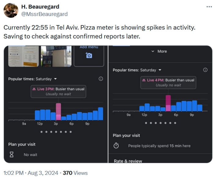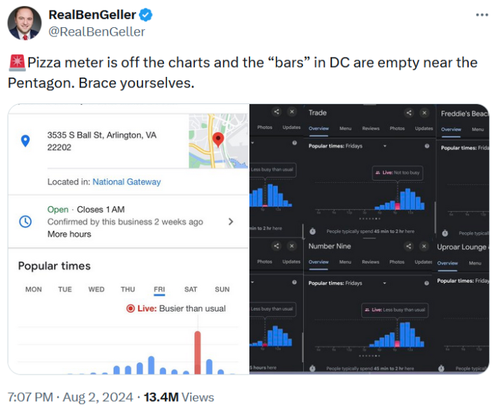 Interest in the theory was revived in August 2024 when former New York legislator Ben Geller noted that a local pizza chain was significantly busier than usual, according to Google, while tensions were building in the Middle East.