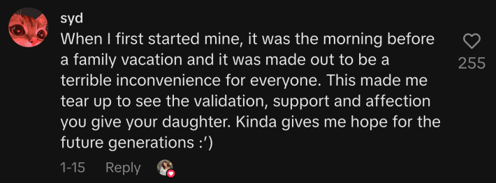 The period cake and Phoenix’s parents’ thoughtful words resonated with girl parents on TikTok who saw how special it was to mark the milestone. People with traumatic first period memories shared how healing the period cake ritual feels for them.