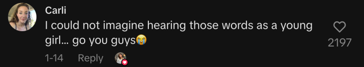 One user wrote, “I could not imagine hearing those words as a young girl… go you guys 😭.”