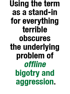 “Online aggression,” in contrast, demands additional detail (what kind? how? where?), thereby discouraging sloppy reporting. If a news account is to make any sense, the person recounting whatever event occurred would be forced to specify the nature and scope of this specific instance of aggression, on what platform the interaction took place, who exactly was targeted, and what resulted from the interaction. This would be far more helpful than simply relying on the term “troll” to do all the work.