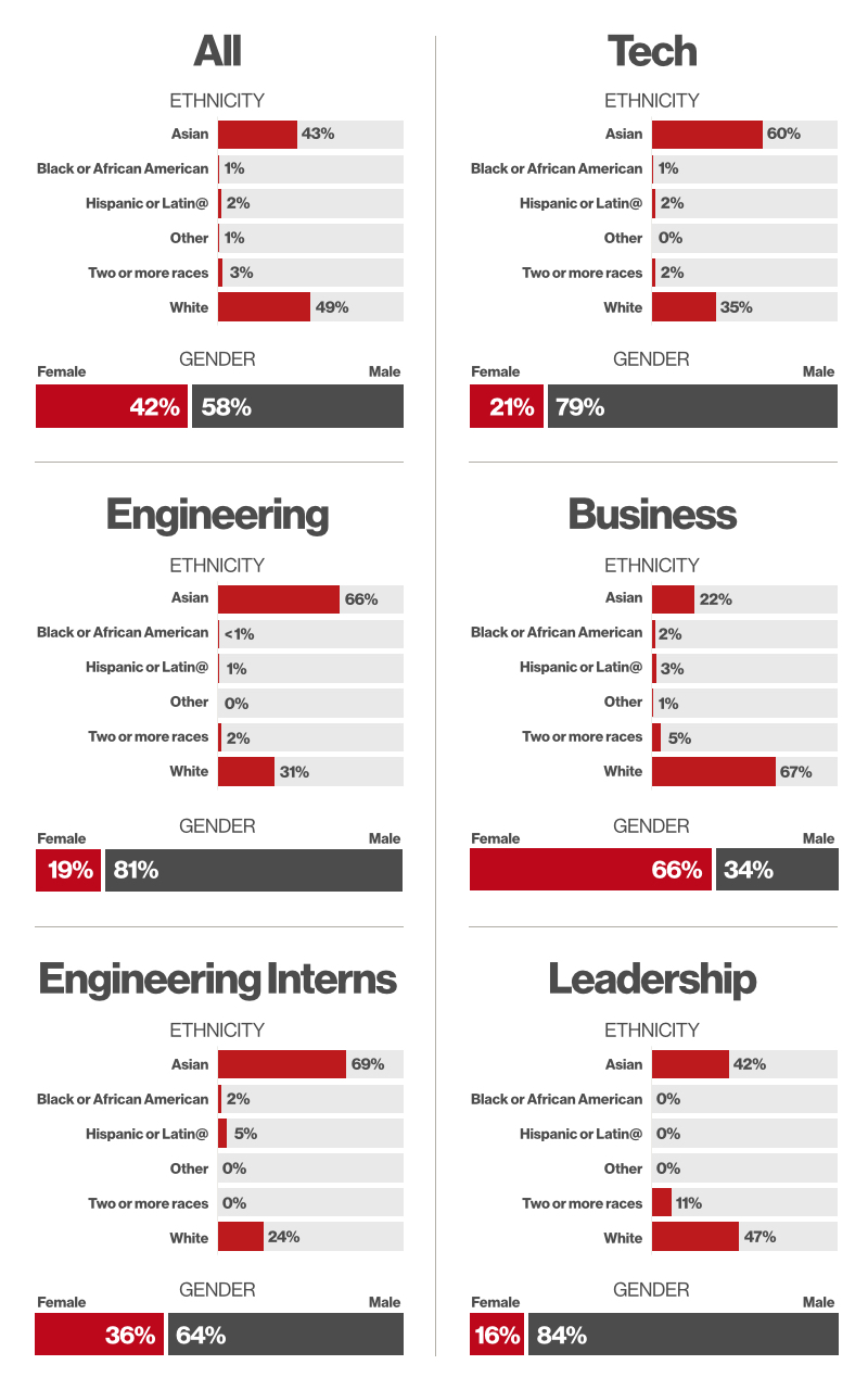 Pinterest engineer Tracy Chou is largely responsible for elevating the conversation about industry transparency in hiring. Her blog post "Where are the numbers?" went viral in 2013, prompting people to demand tech giants show the racial and gender make up of their companies. Unsurprisingly, most companies that released data (including Google, Facebook, Yahoo, and even Pinterest) were mostly white and male.