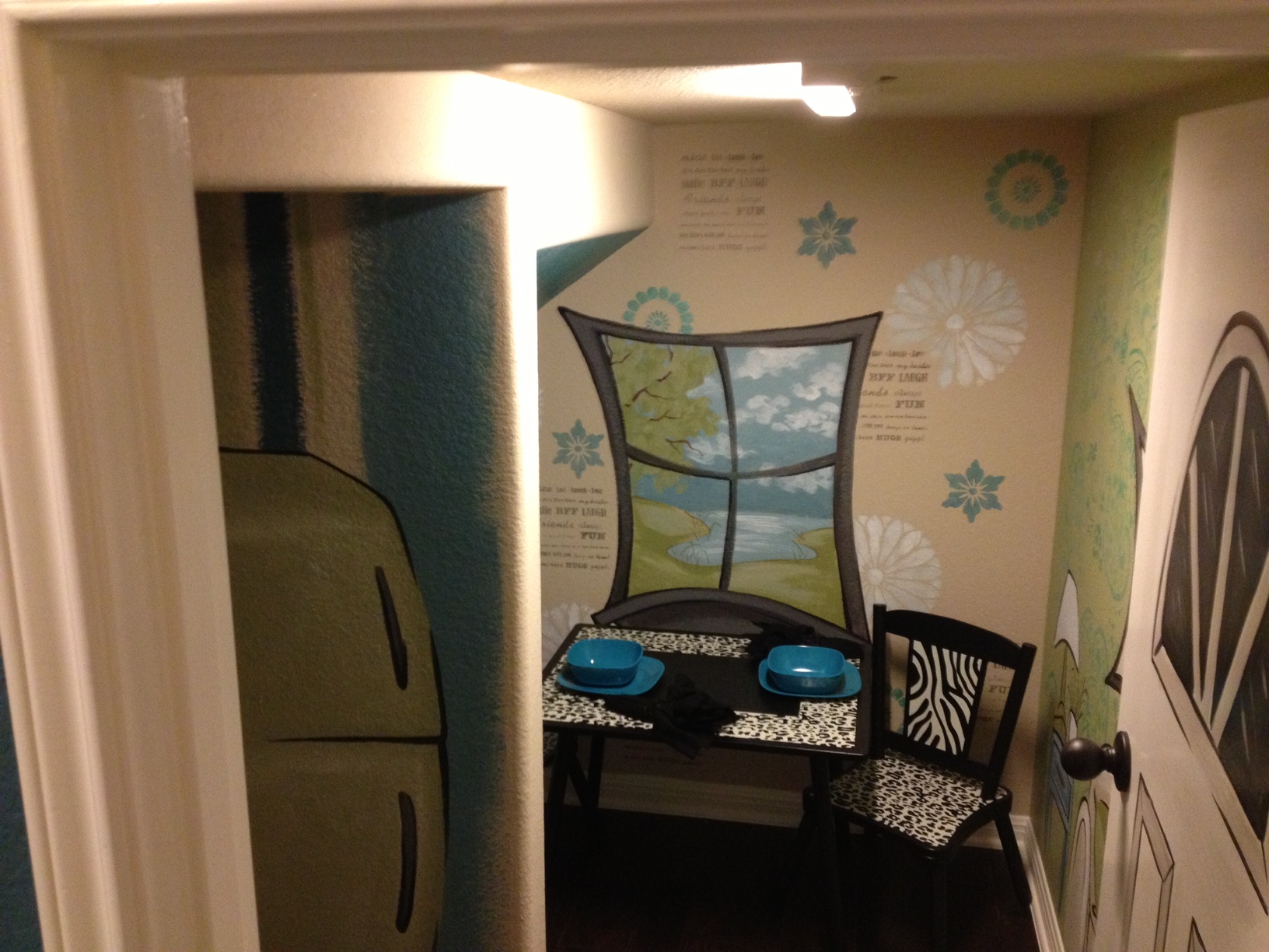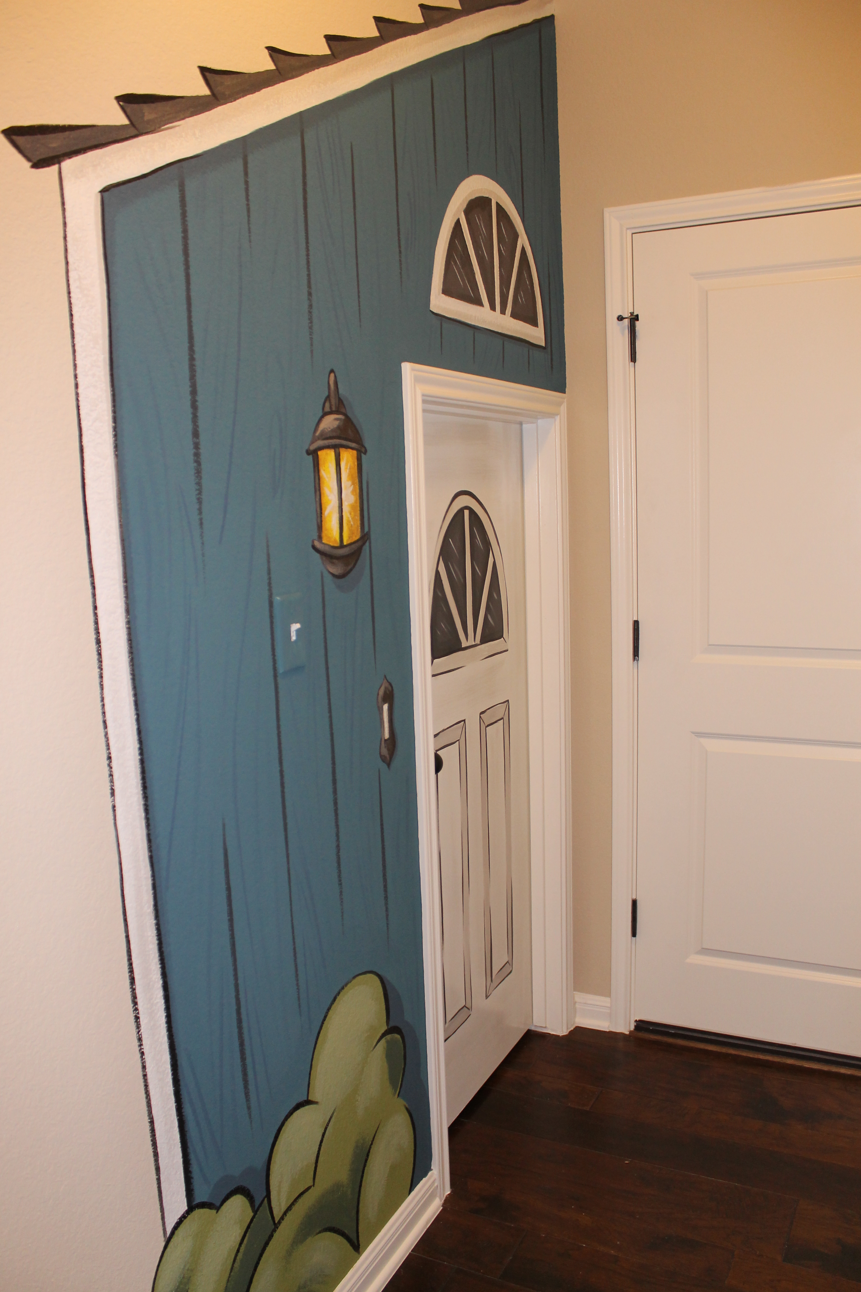 What I'm looking at is a doorframe that's about three-quarters short of normal. It's nestled into a wall underneath the stairs, and around it is a painting that's meant to allude to cottages. This is the children's nook, and on the wall someone has painted a sink and stove.