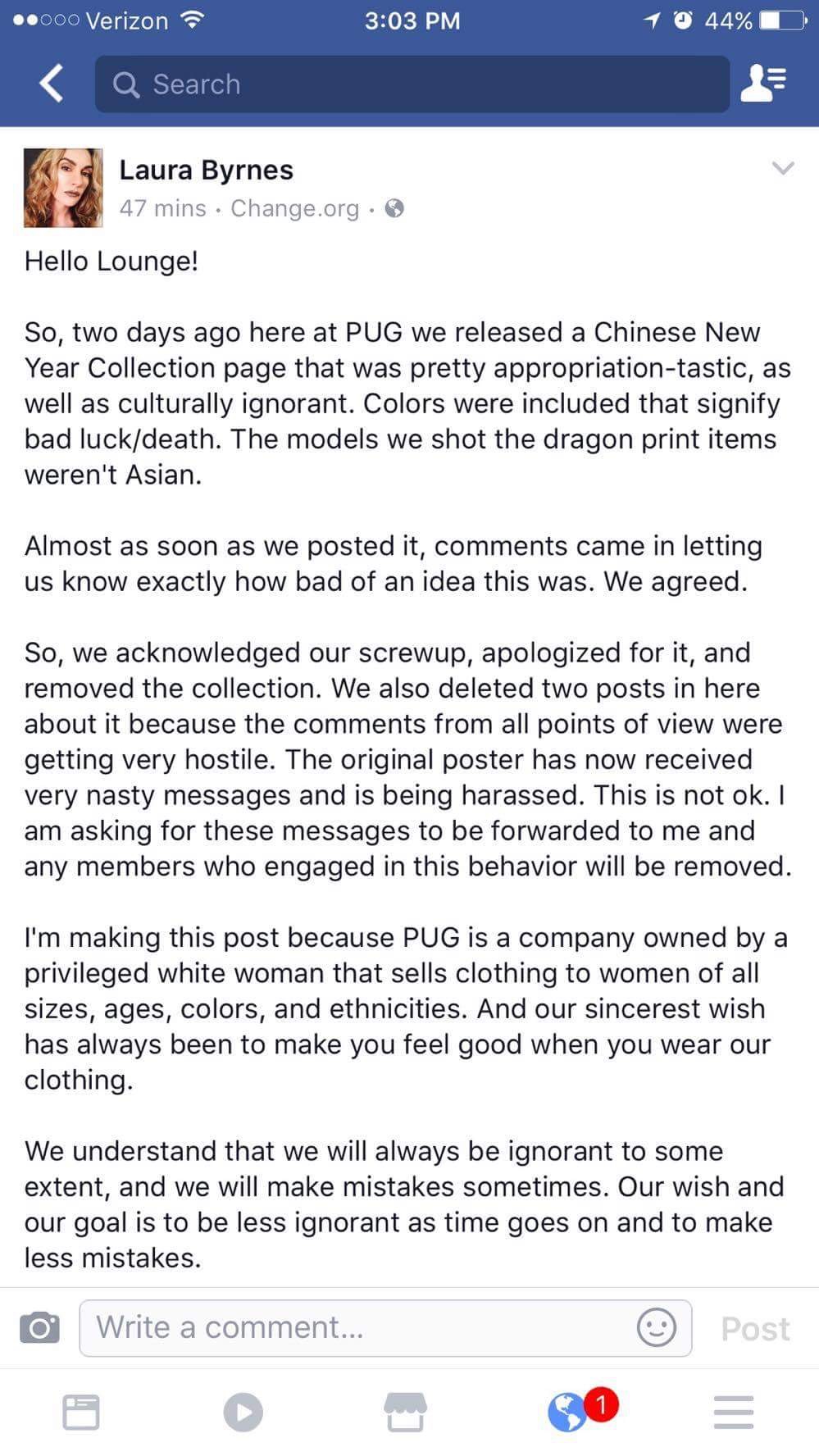 The Change.org petition reads: “This lack of representation along with the fact that PUG chose a dragon print on black fabric for a ‘Chinese New Year’ collection of four items during the Year of the Rooster shows not only how little thought and care they put into this collection, but that they clearly value stereotypical objects of Chinese culture more than they value Chinese people and their many beautiful traditions.”