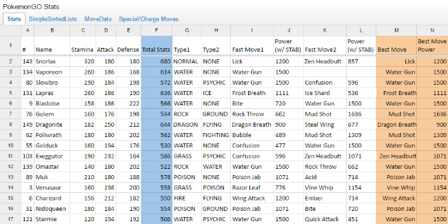 A Pokémon Go stats spreadsheet has also been put together in Google Docs that allows you to sift by base statistics for different Pokémon, data for the different types of moves that Pokémon can make during a battle, and very detailed stats on all the special and charge moves in the game.