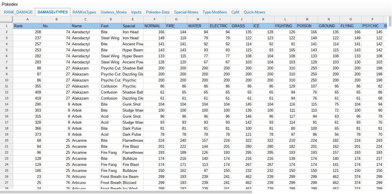 The key to using the spreadsheet properly is to look at how different kinds of attacks affect different kinds of Pokémon, which you can see by clicking the DAMAGEvTYPES tab in the upper-left corner of the spreadsheet. This is the sort of info you want handy when trying to figure out which Pokémon you want to use to attack another team’s Gym.