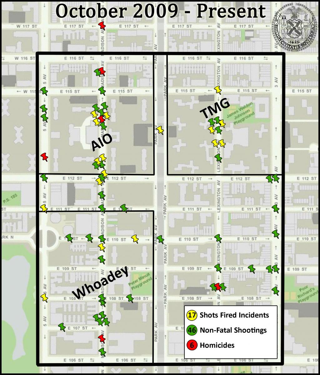 Members of the Air It Out (AIO), True Money Gang (TMG), and Whoadey gangs incriminated themselves in expletive-ridden rants on Facebook, Twitter and YouTube as they terrorized a 30 block area around the northeast corner of Central Park. Police say the gangs were involved in at least three murders, 30 shootings, and countless acts of violence and robbery in the neighborhood beginning in 2009, when three members of the TMG were shot. Locals "lived in fear of getting shot while trying to go about their daily lives," Manhattan District Attorney Cyrus Vance said in a press release announcing the arrests.