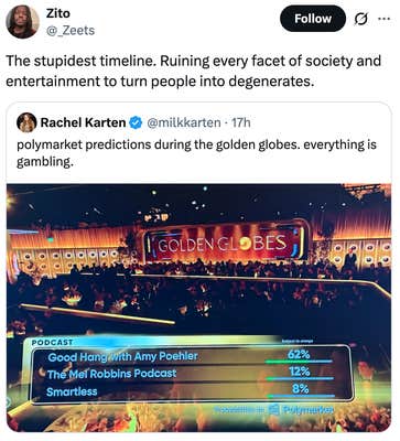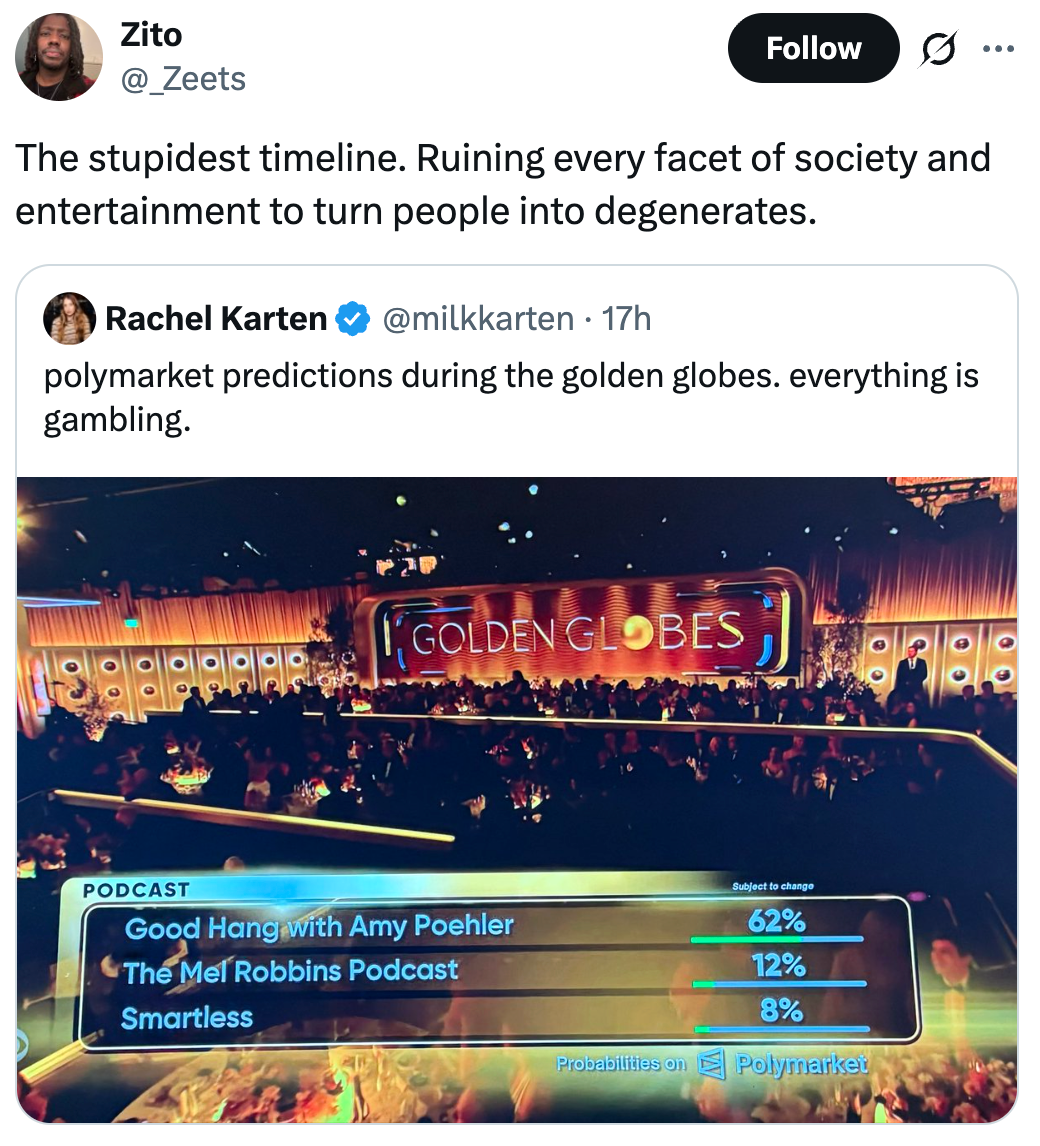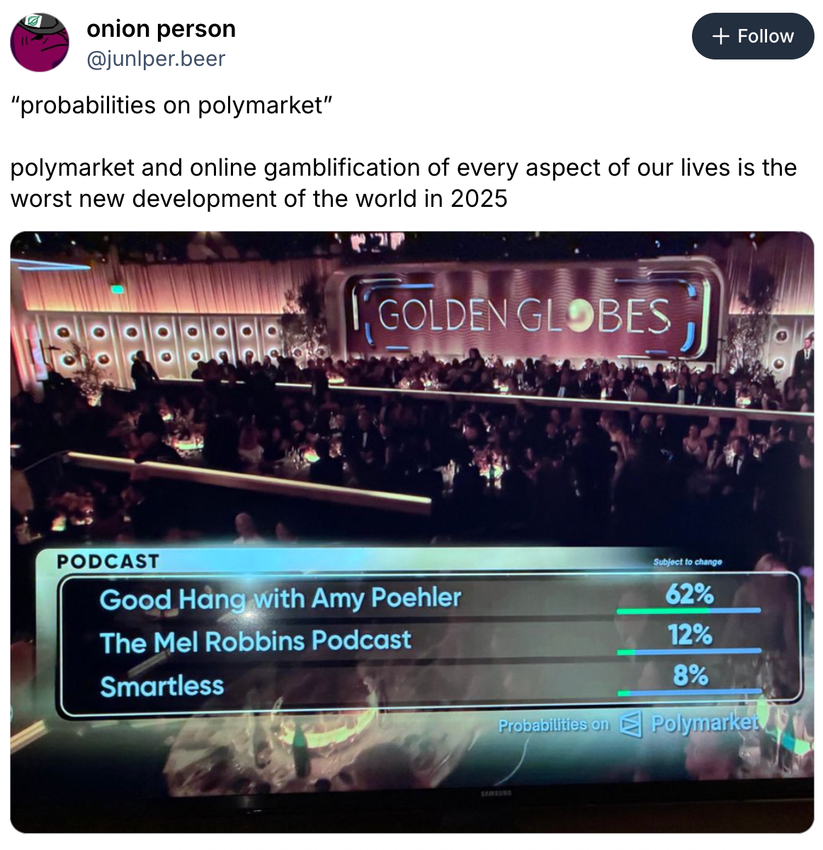 “The Golden Globes Best Podcast odds presented by Polymarket” is a new low for this humiliating awards show pic.twitter.com/aGs0av9GfF