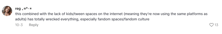 “This combined with the lack of kids/tween spaces on the internet (meaning they’re now using the same platforms as adults) has totally wrecked everything, especially fandom spaces/fandom culture,” explained reg.