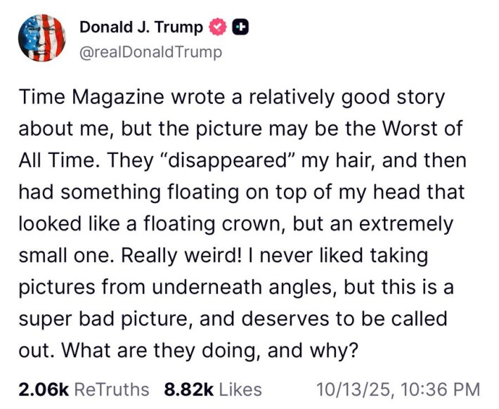 While the November 2025 issue lauded Trump’s peace deal as a major success of his second term, the president fumed on Truth Social that the magazine used a “super bad picture” that made his hair “disappear.”