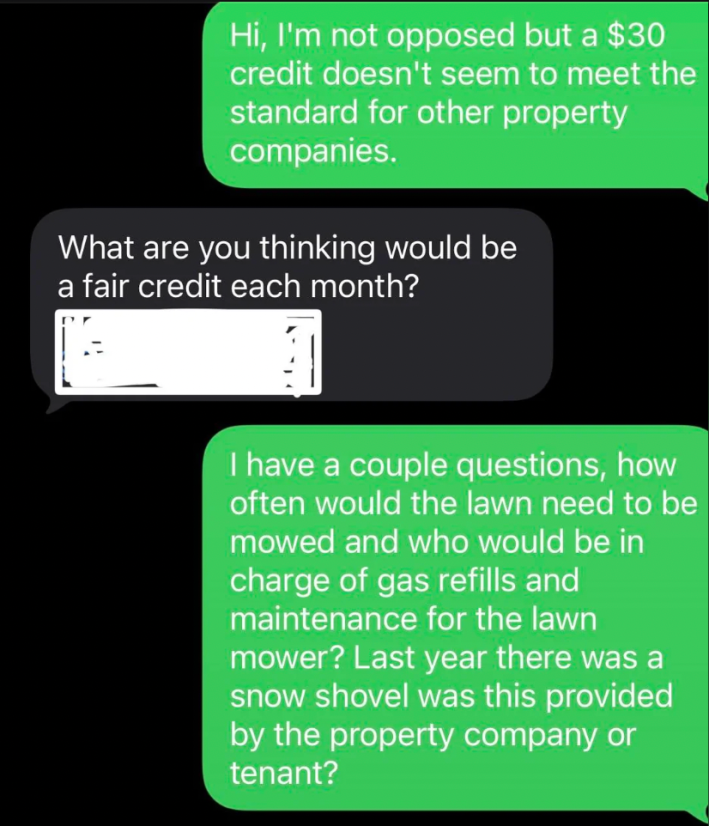 Redditors had a lot to say when Most_Relief8312 shared text messages describing a deal his apartment manager pitched him: A $30 rent credit per month in exchange for a long list of apartment maintenance tasks, including paying for the gasoline in the apartment's lawnmower out of pocket.